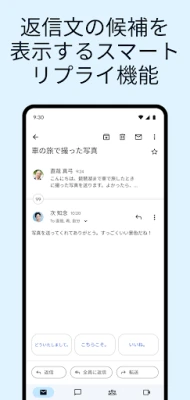 日々のメール管理もGmailなら驚くほどスムーズです。誤送信を未然に防ぐ「送信取り消し」機能や、賢い返信候補を提案する「スマートリプライ」、入力時の予測変換とスペルチェックは、あなたのコミュニケーションをより迅速かつ正確にします。複数のアカウントを自在に切り替えたり、大切なファイルを簡単に添付・共有したりする機能も充実。直感的なスワイプ操作で受信トレイを整理したり、スレッド表示で会話の流れを追ったりと、ストレスフリーなメール体験を提供します。